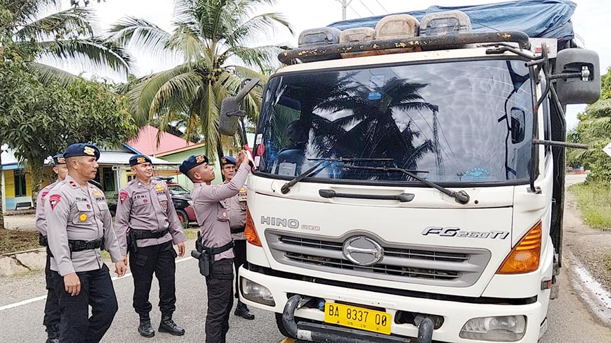 Danki Brimob Kompi 1 Batalyon C Satbrimob Polda Bengkulu saat memasang langusng bendera merah putih ke salah satu kendaraan yang melintas.-Dedi Sumanto-Radar Mukomuko
