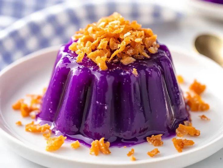 3. Tekstur yang Lembut: Puding ubi ungu memiliki tekstur yang lembut dan kenyal, memberikan sensasi yang menyenangkan di mulut.
