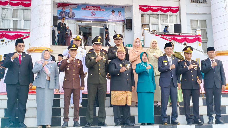 koranrm.id - Pemerintah Kabupaten Mukomuko menggelar upacara memperingati Hari Ulang Tahun (HUT) Provinsi Bengkulu ke-57 yang bertempat di lapangan upacara Setdakan Mukomuko. Bupati Mukomuko, H. Choirul Huda,SH langsug bertindak sebagai Inspektur upacara. Hadir segenap pejabat daerah dan pejabat FKPD serta jajaran juga dari organisasi wanita dan undangan lainnya. Peserta upacara terdiri dari ASN, pelajar, anggota TNI dan Polri. Tema peringatan tahun ini adalah ‘Dengan Semangat Merah Putih Bersama Bantu Rakyat’.