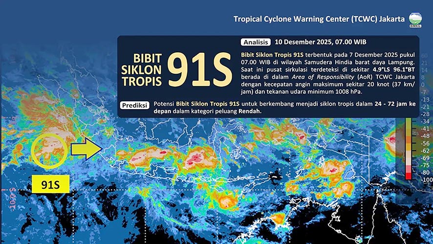 Bibit Siklon 91S berada di posisi 5.7 LS dan 100.1 BT, dengan pergerakan menuju selatan hingga barat daya Bengkulu pada pagi hari. Memasuki siang hingga sore hari, sistem ini diprediksi akan bergerak ke barat daya hingga barat dan perlahan menjauhi wilayah Indonesia. Bibit siklon ini tetap berpotensi memicu cuaca ekstrem di sejumlah daerah.